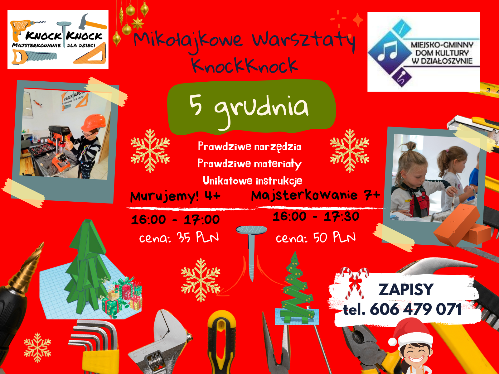 Zapraszamy WSZYSTKIE Dzieci z gminy Działoszyn do wspólnego Mikołajkowego majsterkowania 5.12.2025 r. w Miejsko - Gminny Dom Kultury w Działoszynie