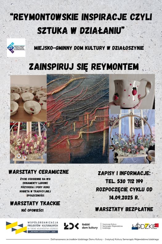 Projekt zakłada realizację spotkań ze sztuką inspirowanych twórczością Władysława Reymonta. Uczestnicy warsztatów poznają podstawy ręcznego tkactwa oraz tworzenia naczyń ceramicznych.