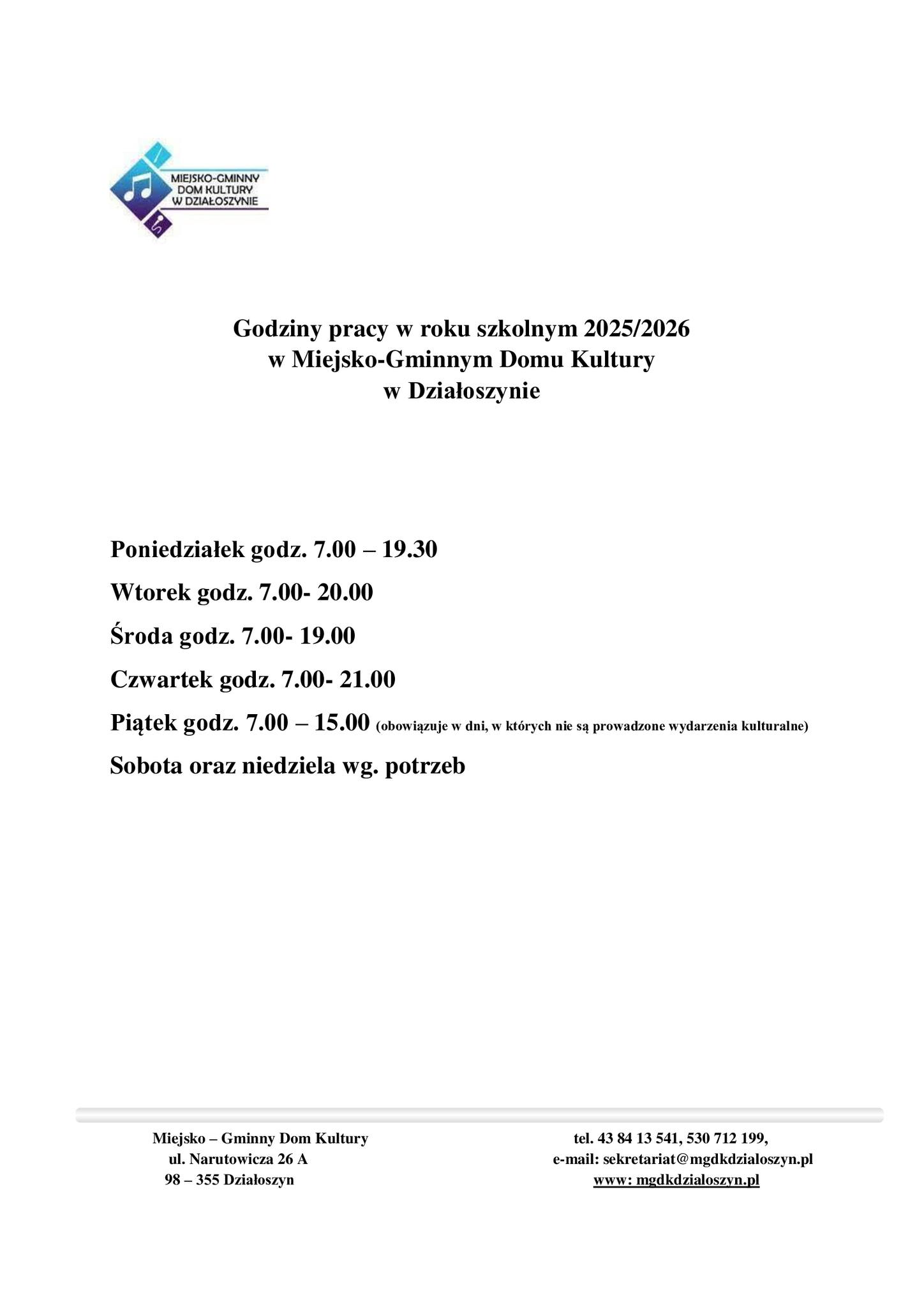 Od 11.08 - 29.08. 2025 r. MGDK jest czynny w godzinach 7.00- 15.00 ( obowiązuje wakacyjny czas pracy). Od dnia 1.09 obowiązują stałe godziny otwarcia instytucji w sezonie kulturalnym 2025/2026 ( zostaną podane pod koniec sierpnia).
